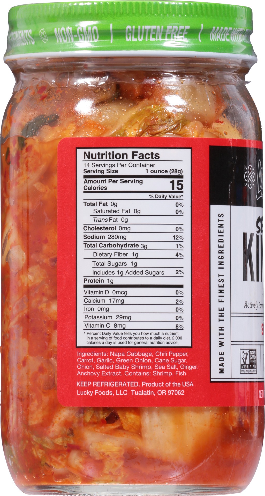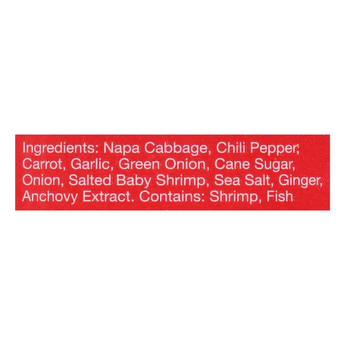 Napa Cabbage, Chili Pepper, Carrot, Garlic, Green Onion, Cane Sugar, Onion, Salted Baby Shrimp, Sea Salt, Ginger, Anchovy Extract.