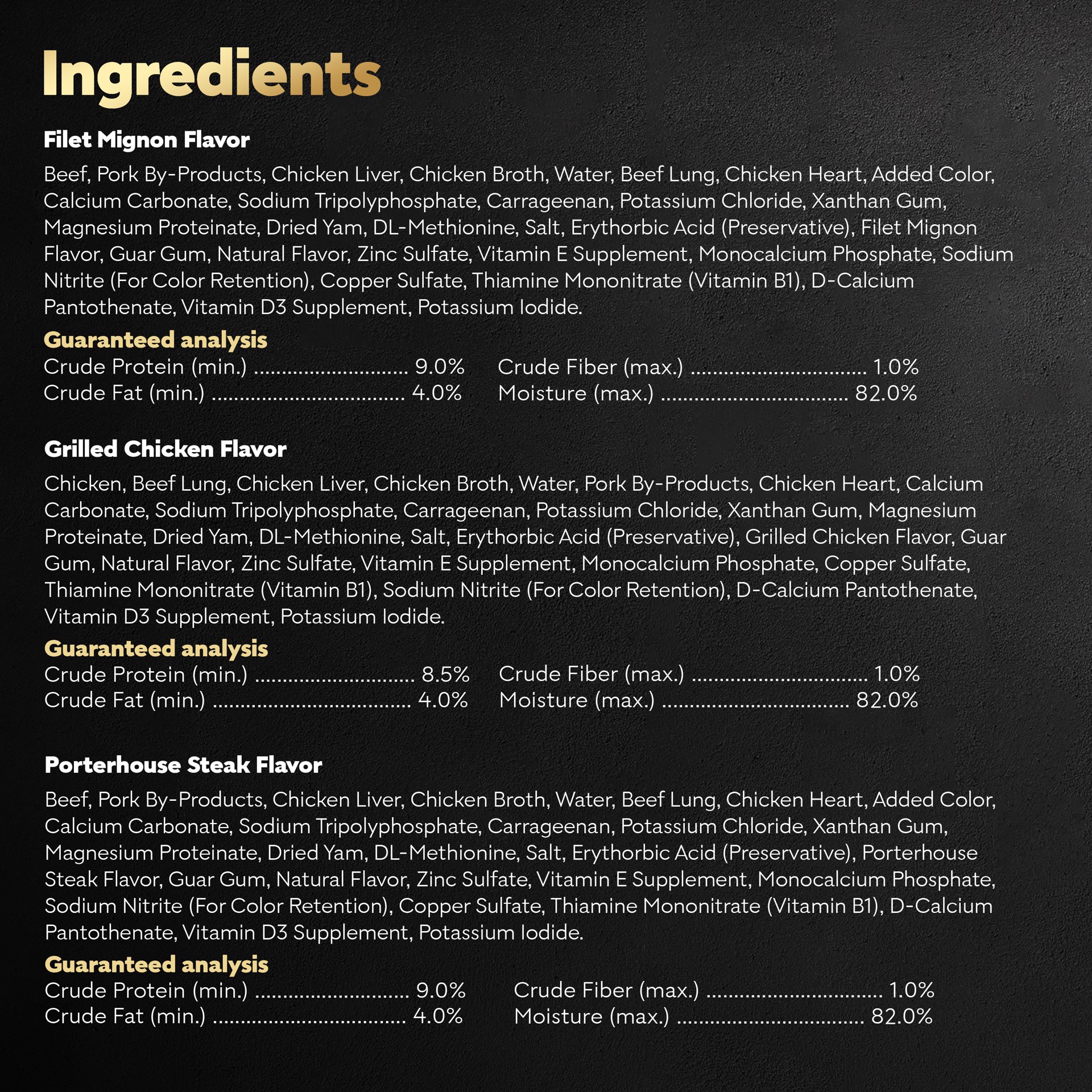 Classic Loaf in Sauce Grilled Chicken Flavor: Chicken, Beef Lung, Chicken Liver, Chicken Broth, Water, Pork By-Products, Chicken Heart, Calcium Carbonate, Sodium Tripolyphosphate, Carrageenan, Potassi…