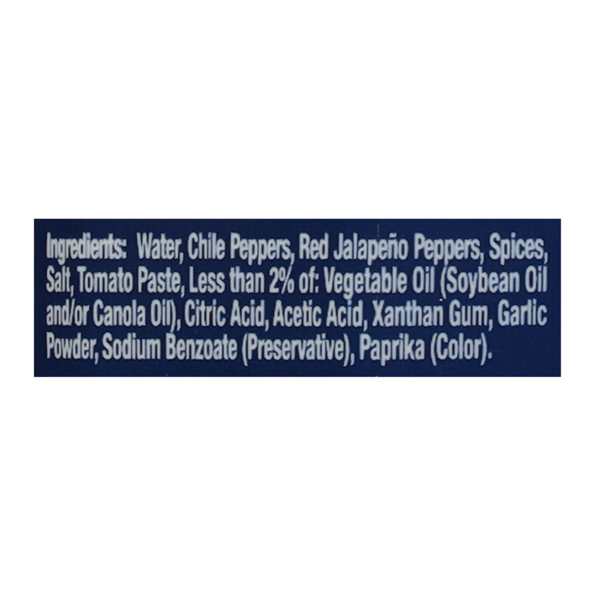 Water, Chile Peppers, Red Jalapeno Peppers, Spices, Salt, Tomato Paste, Less than 2% of: Vegetable Oil (Soybean Oil and/or Canola Oil), Citric Acid, Acetic Acid, Xanthan Gum, Garlic Powder, Sodium Ben…