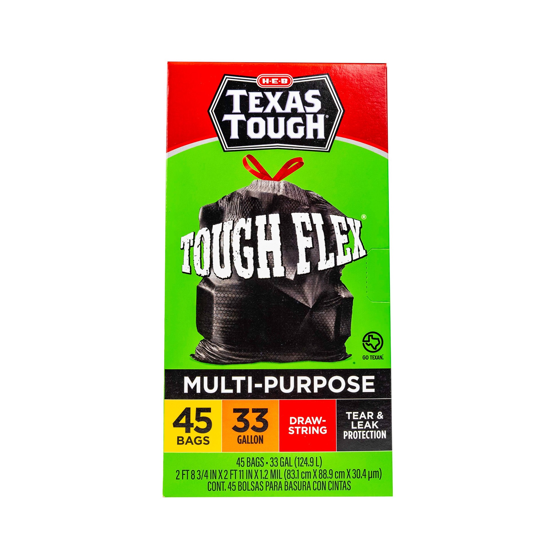 Designed to flex and fit bulky, odd-shaped items without ripping, these large H-E-B Texas Tough multipurpose trash bags have a roomy 33-gallon capacity. Handy for gathering up stuff around the house o…