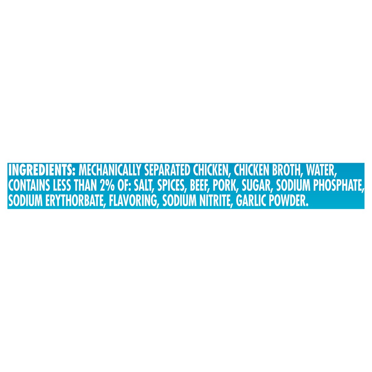 Mechanically Separated Chicken, Chicken Broth, Water, Contains less than 2% of: Salt, Spices, Beef, Pork, Sugar, Sodium Phosphate, Sodium Erythorbate, Flavoring, Sodium Nitrite, Garlic Powder.