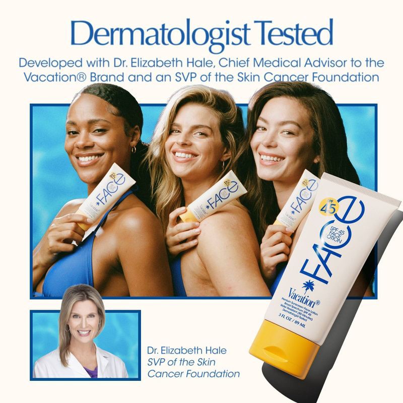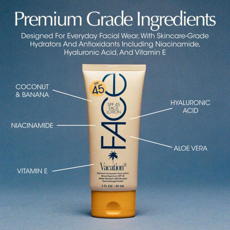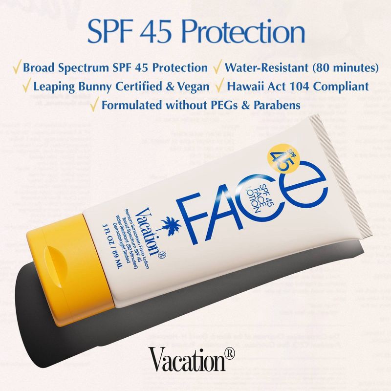 Discover the ultimate in facial protection with Vacation® Classic Face Lotion: an SPF 45 sunscreen face lotion specially formulated for daily use or leisure. Boasting an ultra-light “barely there” fee…