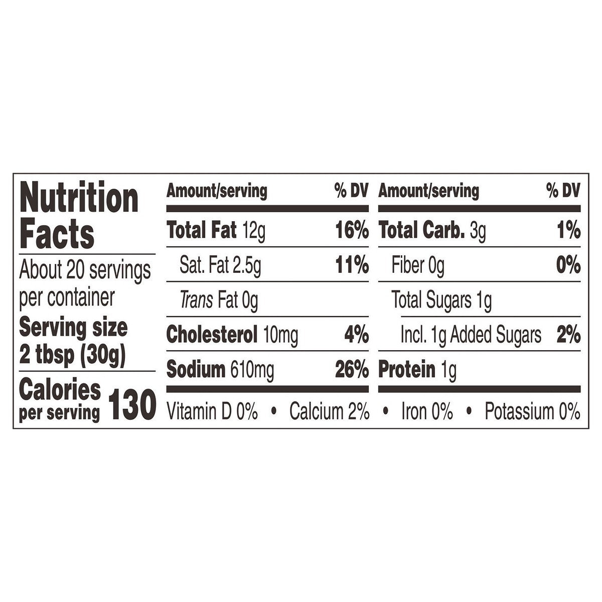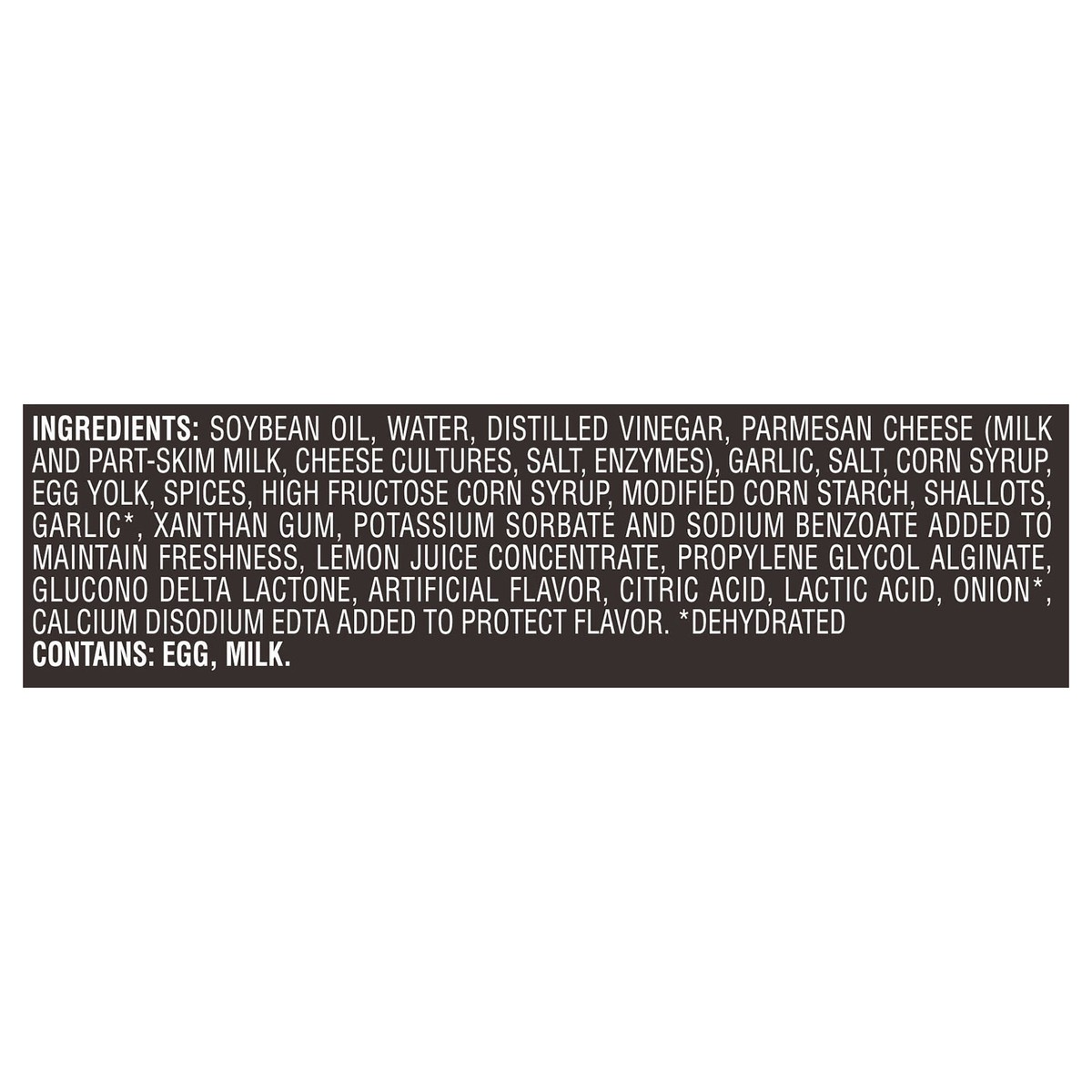 Soybean Oil, Water, Distilled Vinegar, Parmesan Cheese (Milk and Part-Skim Milk, Cheese Cultures, Salt, Enzymes), Garlic, Salt, Corn Syrup, Egg Yolk, Spices, High Fructose Corn Syrup, Modified Corn St…