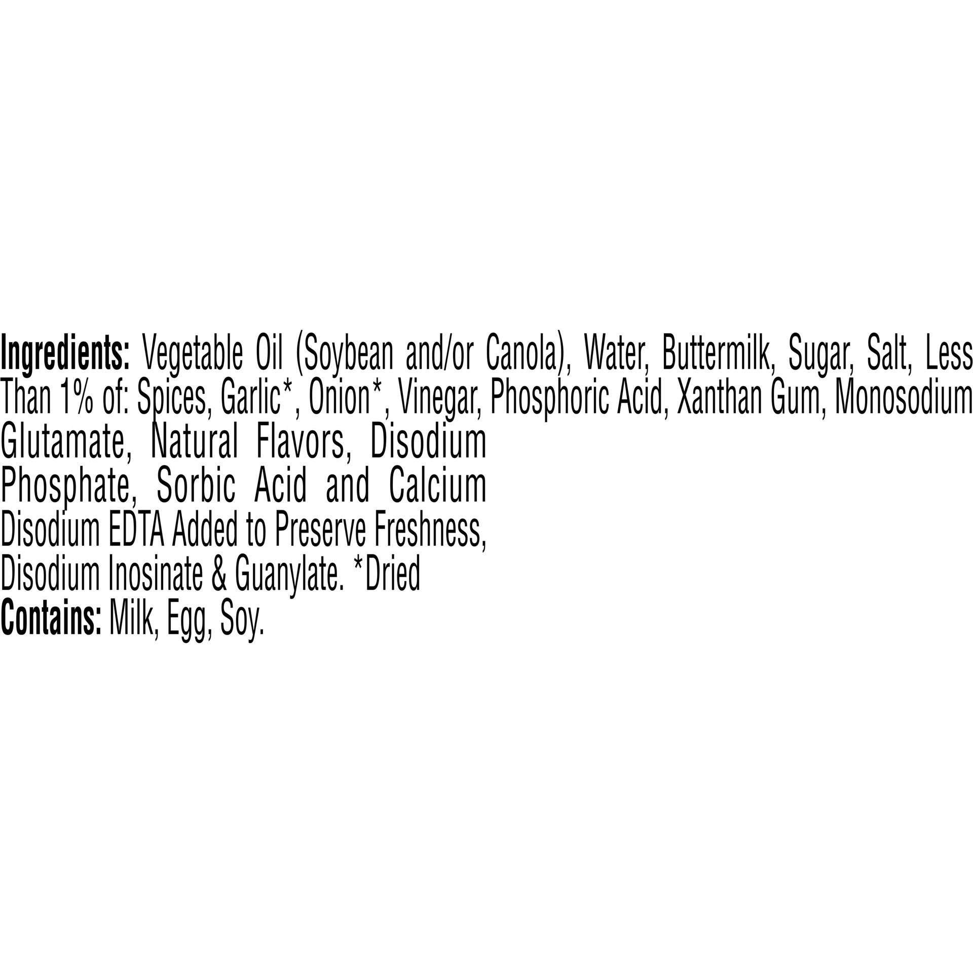 Vegetable Oil (Soybean and/or Canola), Water, Buttermilk, Sugar, Salt, Less Than 1% of: Spices, Garlic (2), Onion (2), Vinegar, Phosphoric Acid, Xanthan Gum, Monosodium Glutamate, Natural Flavors, Dis…
