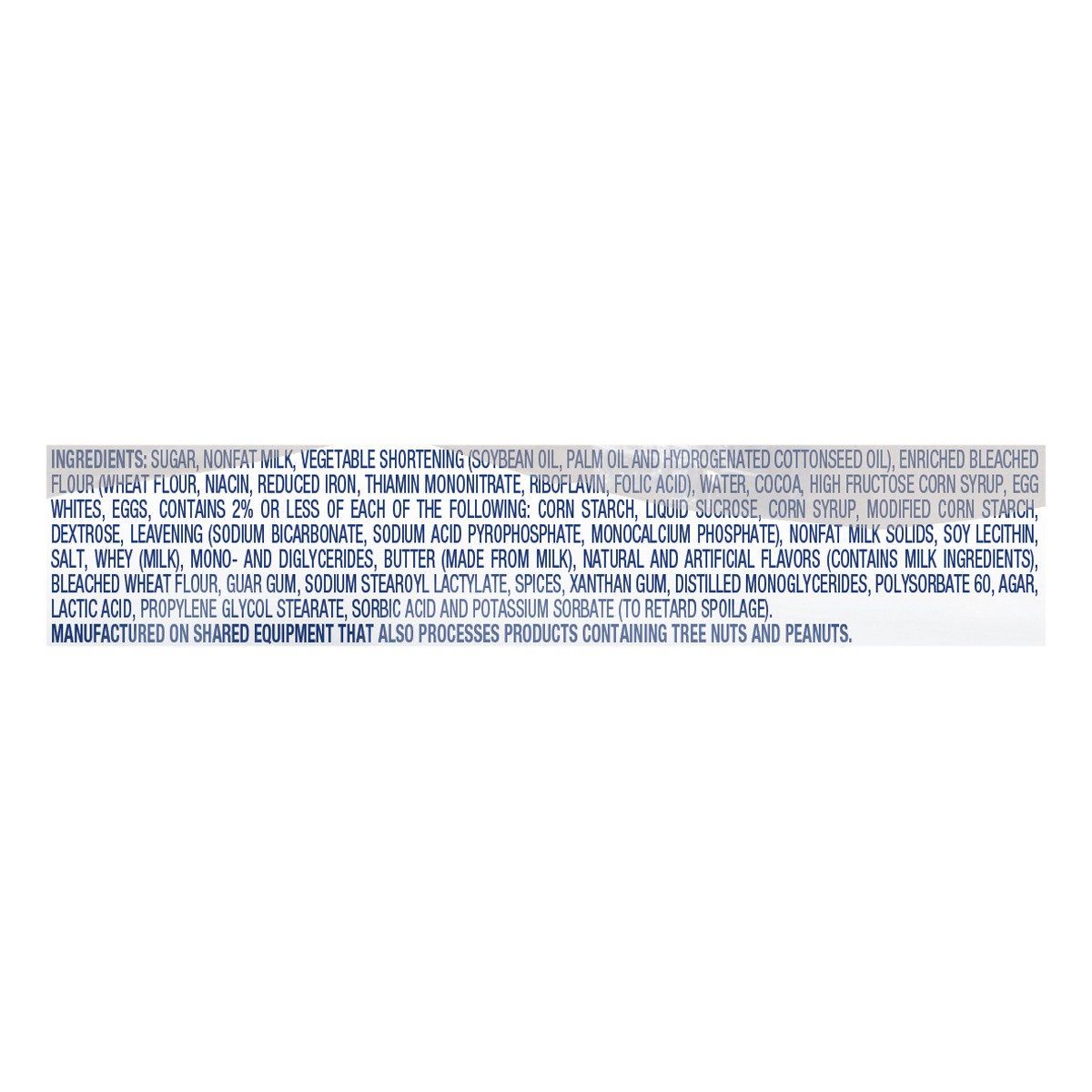 Sugar, Nonfat Milk, Vegetable Shortening (Soybean Oil, Palm Oil and Hydrogenated Cottonseed Oil), Enriched Bleached Flour (Wheat Flour, Niacin, Reduced Iron, Thiamin Mononitrate, Riboflavin, Folic Aci…