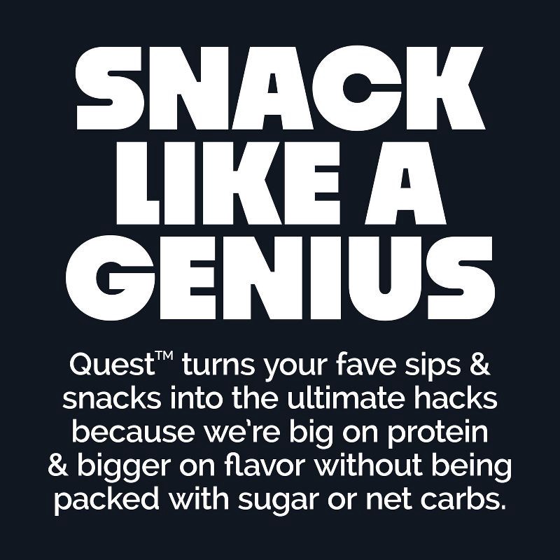 - SNACK LIKE A GENIUS. Quest turns your fave snacks into the ultimate hacks. So reaching your goals has never been tastier. Quest is big on protein, low on sugar and huge on flavor. Yep. It's basically cheating.