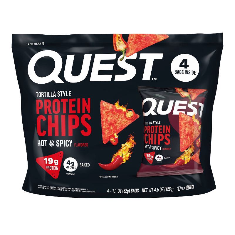 - HACK YOUR SNACK. Quest Hot & Spicy Flavor Tortilla Style Protein Chips are baked. And with 4g of net carbs* they bring the bold flavor, spicy kick, and fantastic crunch that keeps you reaching for more.