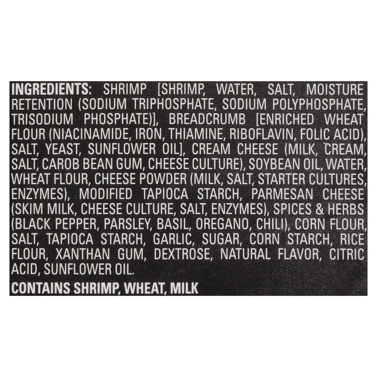 Shrimp [Shrimp, Water, Salt, Moisture Retention (Sodium Triphosphate, Sodium Polyphosphate, Trisodium Phosphate)], Breadcrumb [Enriched Wheat Flour (Niacinamide, Iron, Thiamine, Riboflavin, Folic Acid…