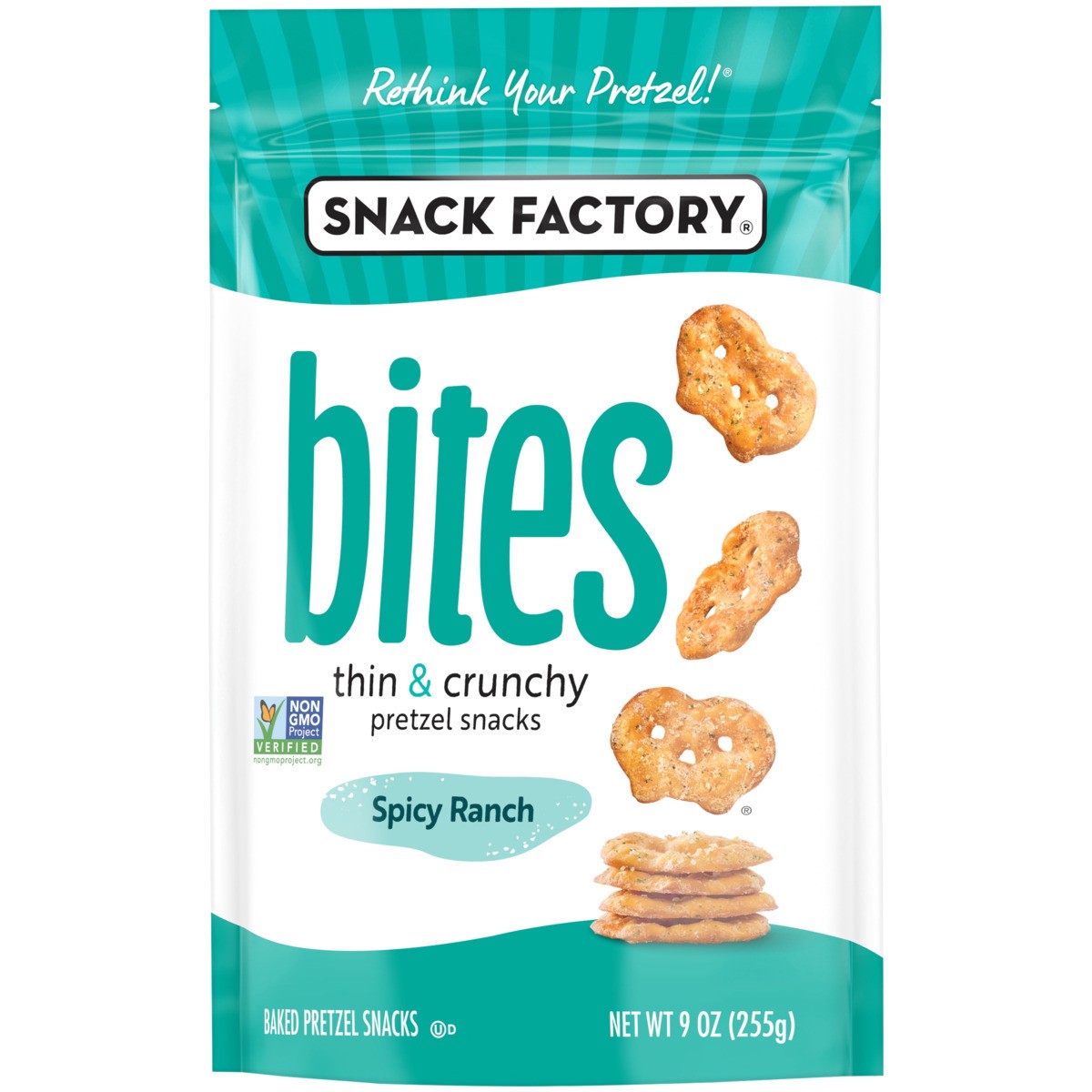 Reimagine pretzels with Snack Factory Spicy Ranch Bites. Thin and crunchy, and boldly delicious, Snack Factory Bites are a snackable, bite-sized version of Pretzel Crisps. These baked pretzel snacks b…