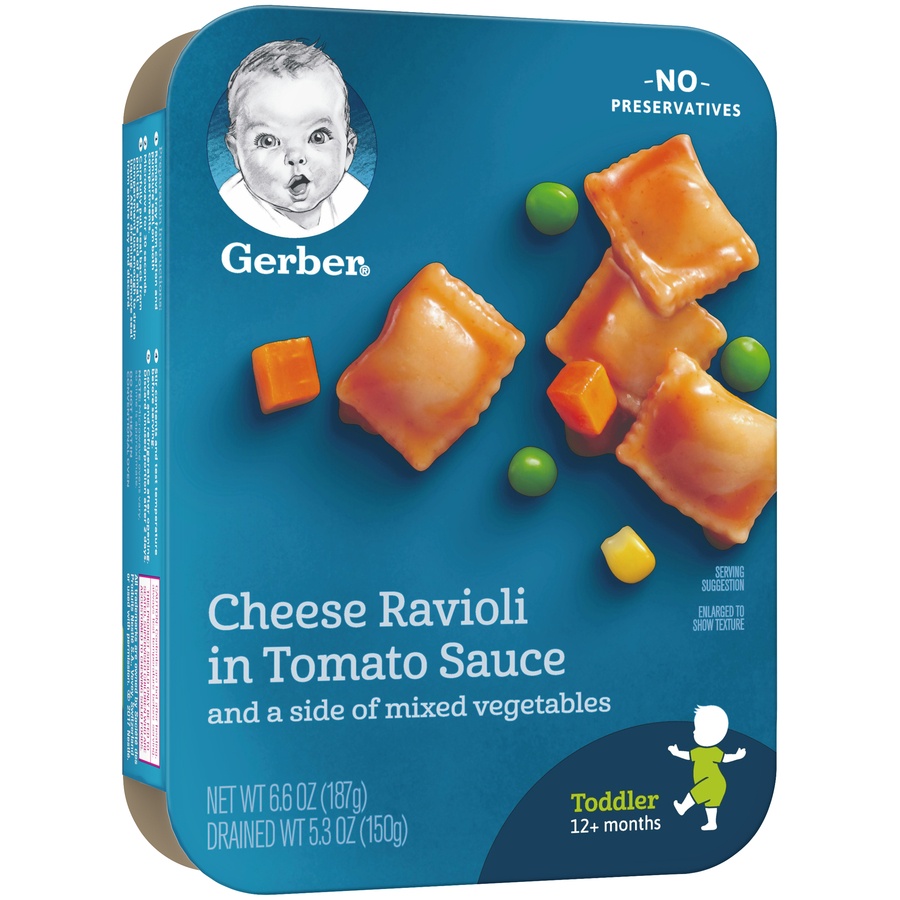 - Gerber ravioli is filled with cheese and comes in tomato sauce with a side of mixed veggies for delicious flavor