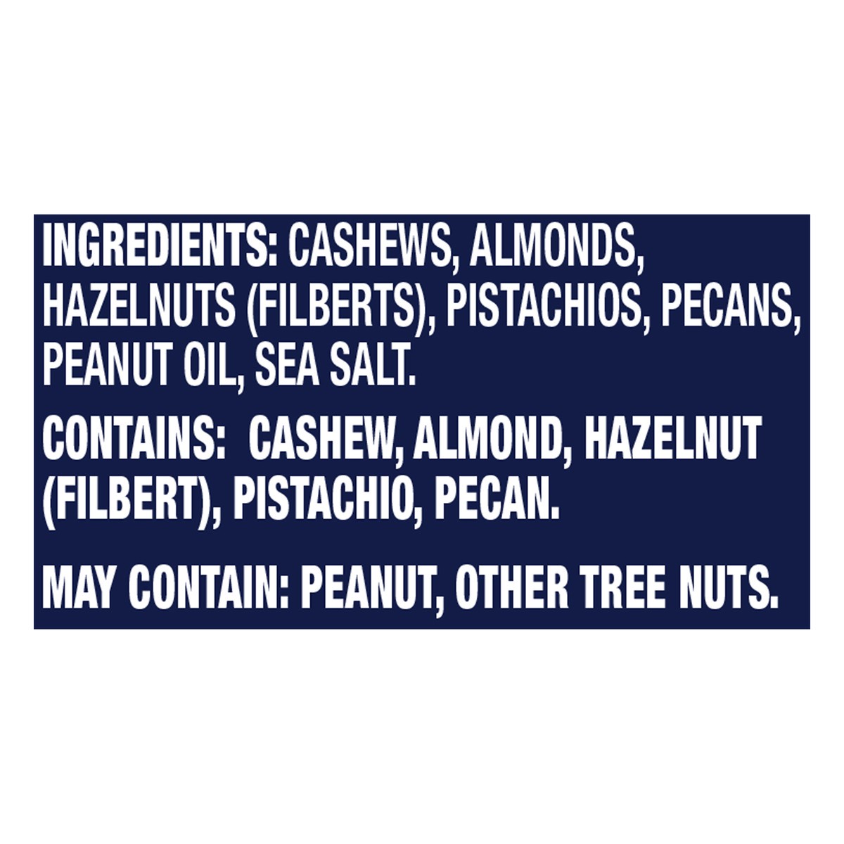 Cashews, Almonds, Hazelnuts (Filberts), Pistachios, Pecans, Peanut Oil, Sea Salt.