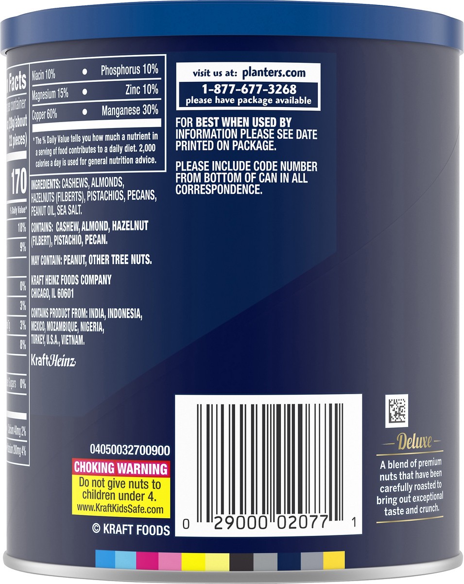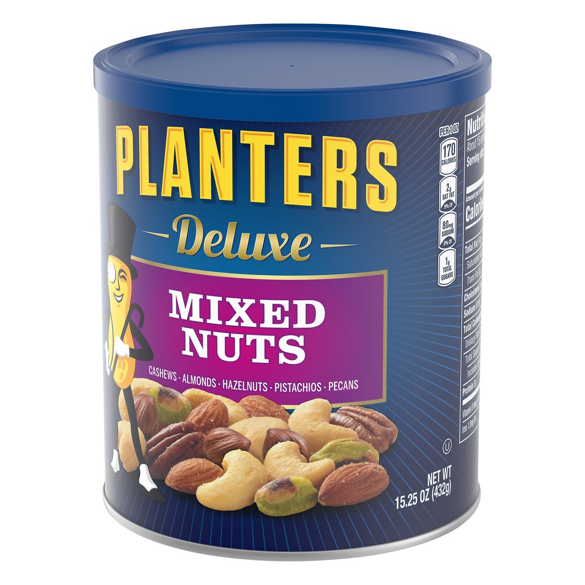 Cashews. Almonds. Hazelnuts. Pistachios. Pecans. Per 1 oz: 170 calories; 2 g sat fat (9% DV); 80 mg sodium (3% DV); 1 g total sugars. Deluxe. A blend of premium nuts that have been carefully roasted t…