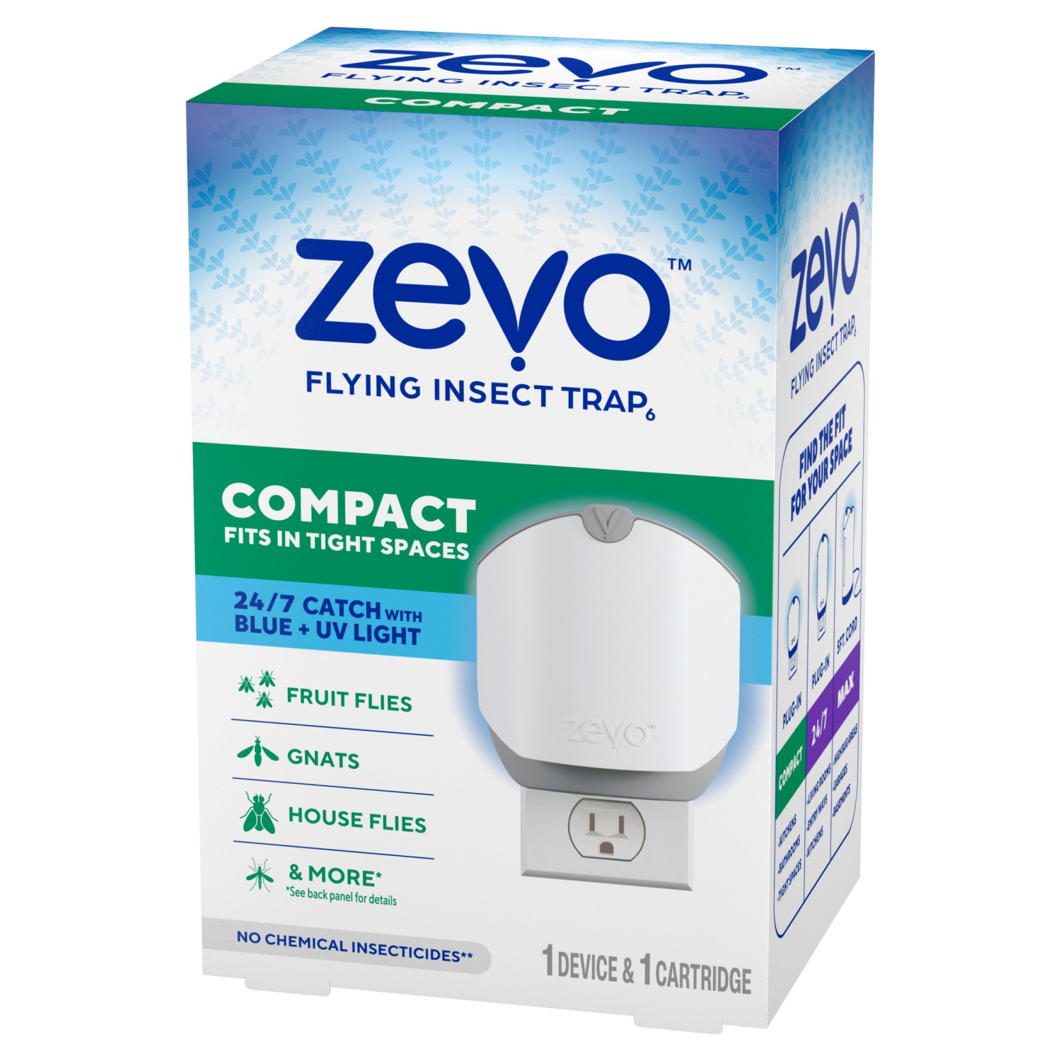 Zevo Compact Flying Insect Indoor Fly Trap: Easy, Mess-Free Solution For Tight Spaces - Light Trap Catches & Kills House Flies, Fruit Flies, Gnats, & More (1 Plug In Device & 1 Refill Cartridge)