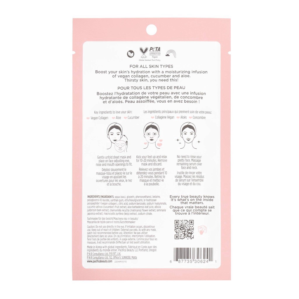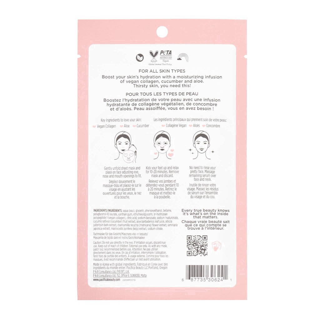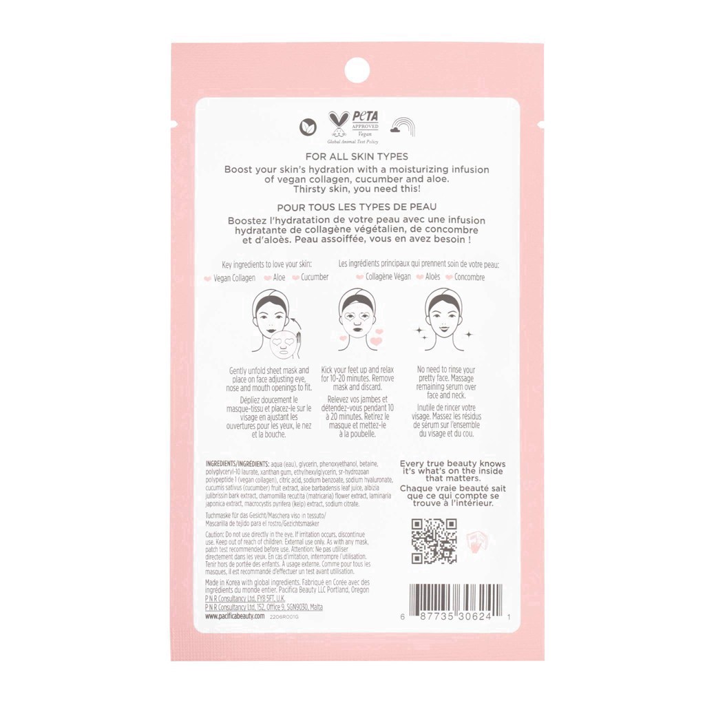A hydrating & plumping fermented-peptide serum-soaked sheet mask that hugs the face with fine natural microfibers, and a potent formulation of vegan collagen peptides, cucumber, and aloe. For instantl…