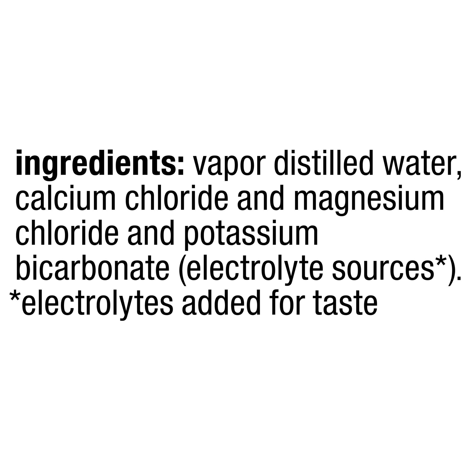 pure, vapor-distilled water. premium bottled water with added electrolytes for a pure, crisp taste. 100% recyclable bottle.