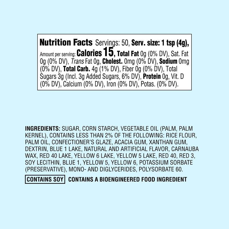 SUGAR, CORNSTARCH, VEGETABLE OIL (PALM OIL, PALM KERNEL OIL), LESS THAN 2% OF RICE FLOUR, PALM OIL, CONFECTIONERS GLAZE, ACACIA GUM, XANTHAN GUM, DEXTRIN, BLUE 1 LAKE, RED 40 LAKE, NATURAL AND ARTIFIC…