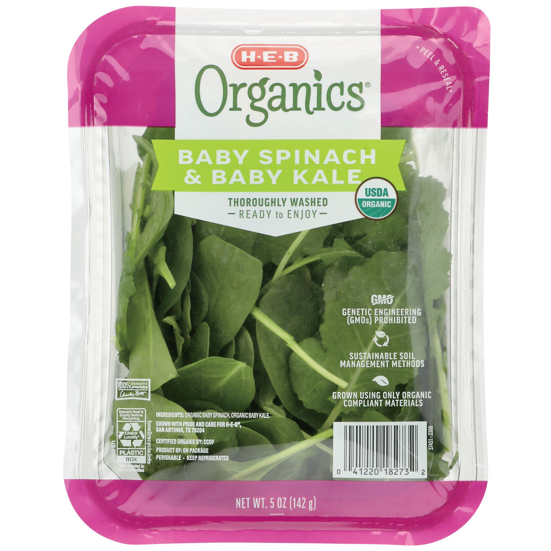Thoroughly washed and ready to use, H-E-B Organics Baby Spinach & Kale is a nutritious all-in-one duo. Steam or sauté some for a delicious dinnertime side, or use in salads, omelets or quiche.• Baby s…