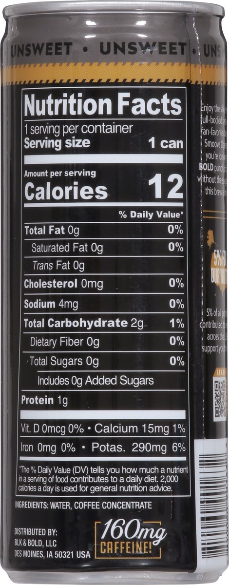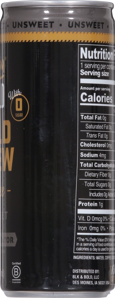 BLK & Bold Unsweet Cold Brew Coffee Cold brew in its purest form (no milk or cream and zero sugar)! This unsweet ready-to-drink dark roast cold brew coffee is packed full of flavor and caffeine (160 m…