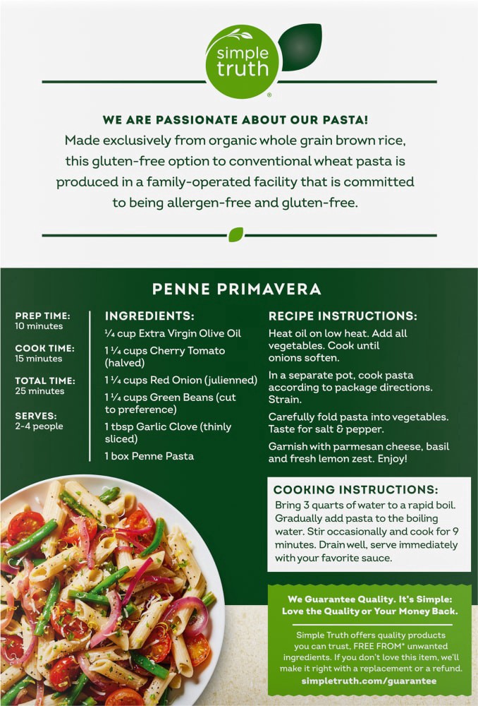 Simple Truth® Gluten Free Brown Rice Penne Pasta brims with delicious flavor. Containing one ingredient, organic brown rice flour, every forkful delivers the unmistakable texture of traditional pasta.…