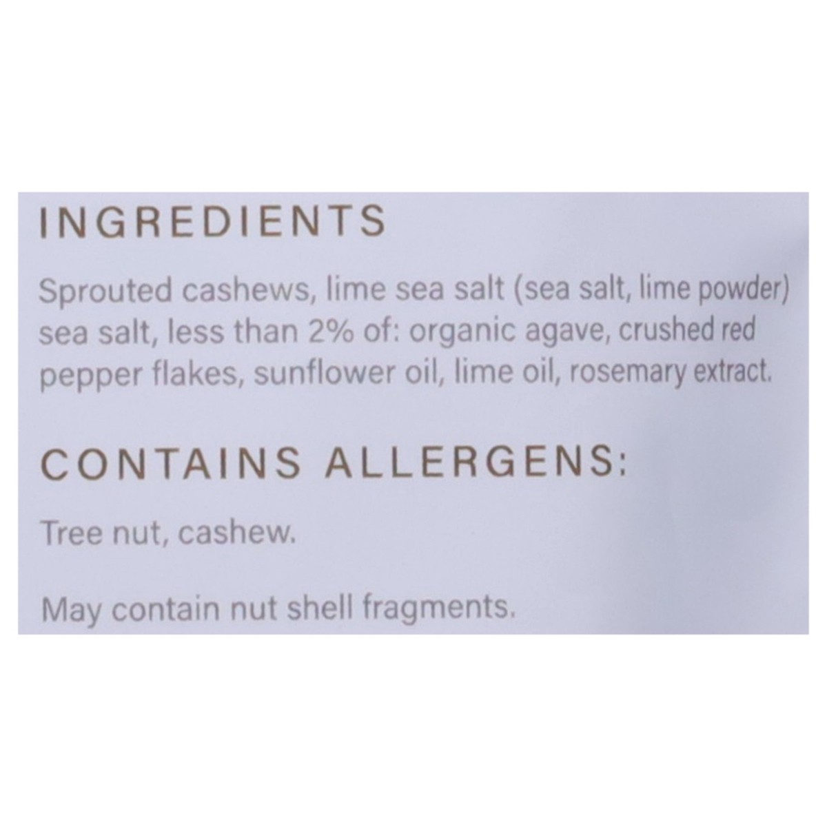 Sprouted Cashews, Lime Sea Salt (Sea Salt, Lime Powder) Sea Salt, Less than 2% of: Organic Agave, Crushed Red Pepper Flakes, Sunflower Oil, Lime Oil, Rosemary Extract.