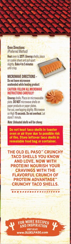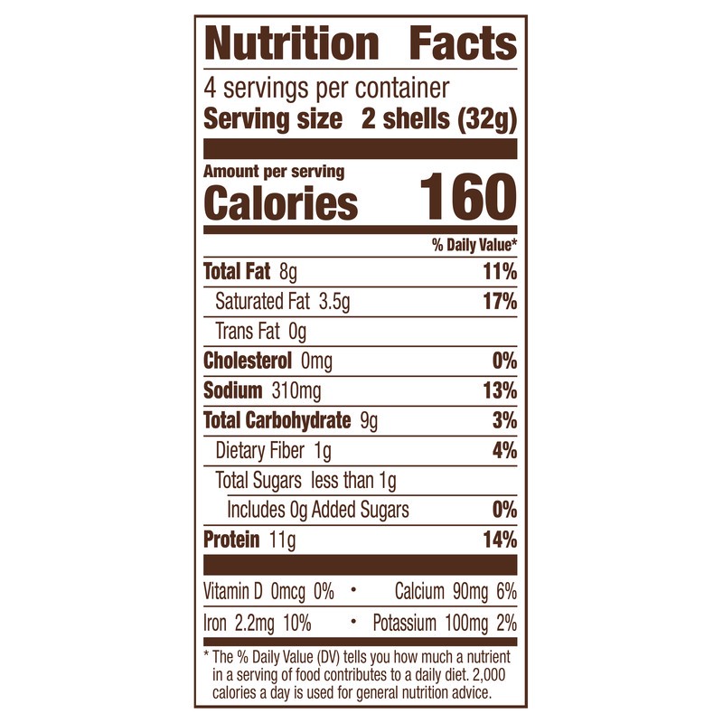 11 g of protein per two shells. Per 2 Shells: 160 calories; 3.5 g sat fat (17% DV); 310 mg sodium (13% DV); 0 g added sugars (0% DV). Gluten free. Contains bioengineered food ingredients. Learn more a…