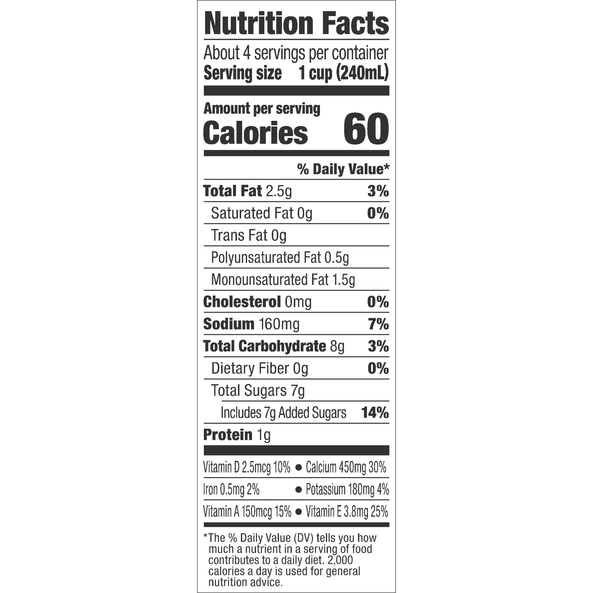 Almondmilk (Water, Almonds), Vitamin and Mineral Blend (Calcium Carbonate, Vitamin E Acetate, Vitamin A Palmitate, Vitamin D2), Sea Salt, Gellan Gum, Locust Bean Gum, Sodium Ascorbate (to Protect Fres…