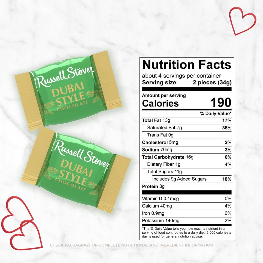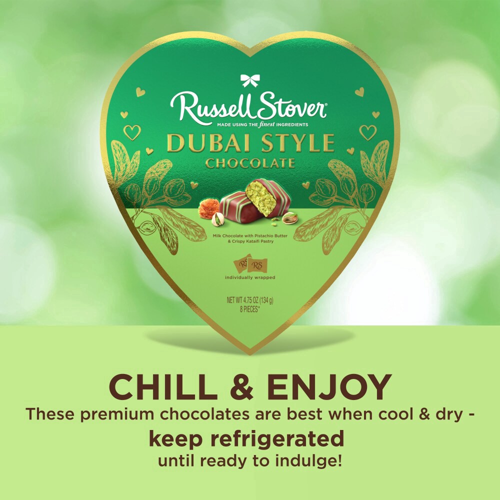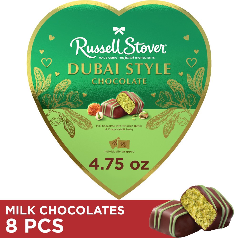 - Fall in love with the new RUSSELL STOVER Valentine's Day Dubai Style Milk Chocolate Candy Pistachio & Kataifi Heart Gift Box - a delicious way to say I LOVE YOU!
