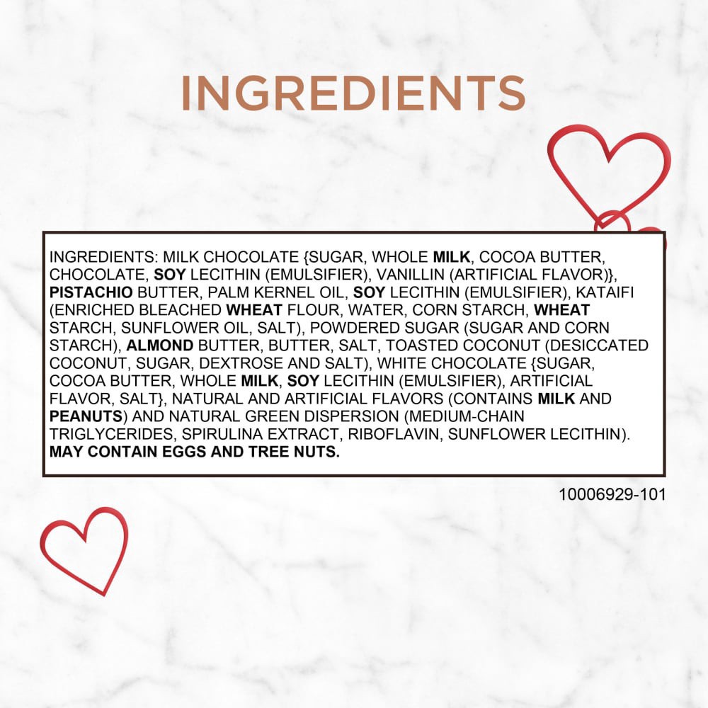 Milk Chocolate (Sugar, Whole Milk, Cocoa Butter, Chocolate, Soy Lecithin (Emulsifier), Vanillin (Artificial Flavor)), Pistachio Butter, Palm Kernel Oil, Soy Lecithin (Emulsifier), Kataifi (Enriched Bl…