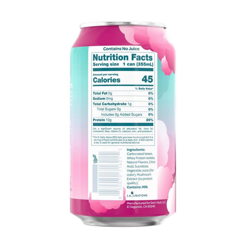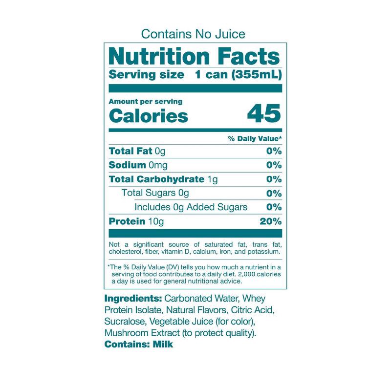Carbonated Water, Whey Protein Isolate, Natural Flavors, Citric Acid, Sucralose, Vegetable Juice (for Color), Mushroom Extract (to Protect Quality).