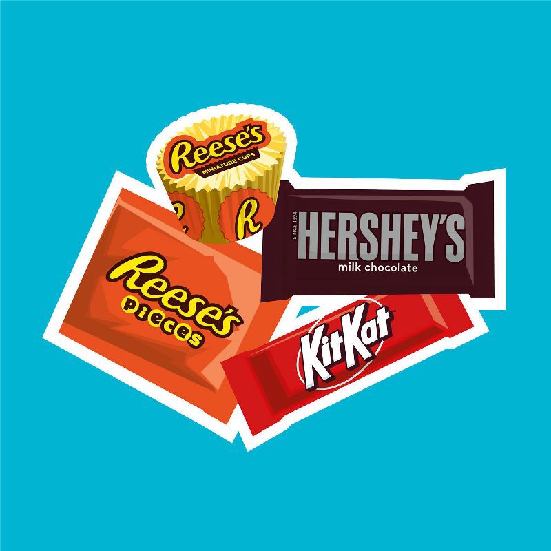 - Includes HERSHEY'S milk chocolate candy bars, KIT KAT® chocolate wafer candy bars, REESE'S milk chocolate peanut butter cups candy and REESE'S PIECES peanut butter candy