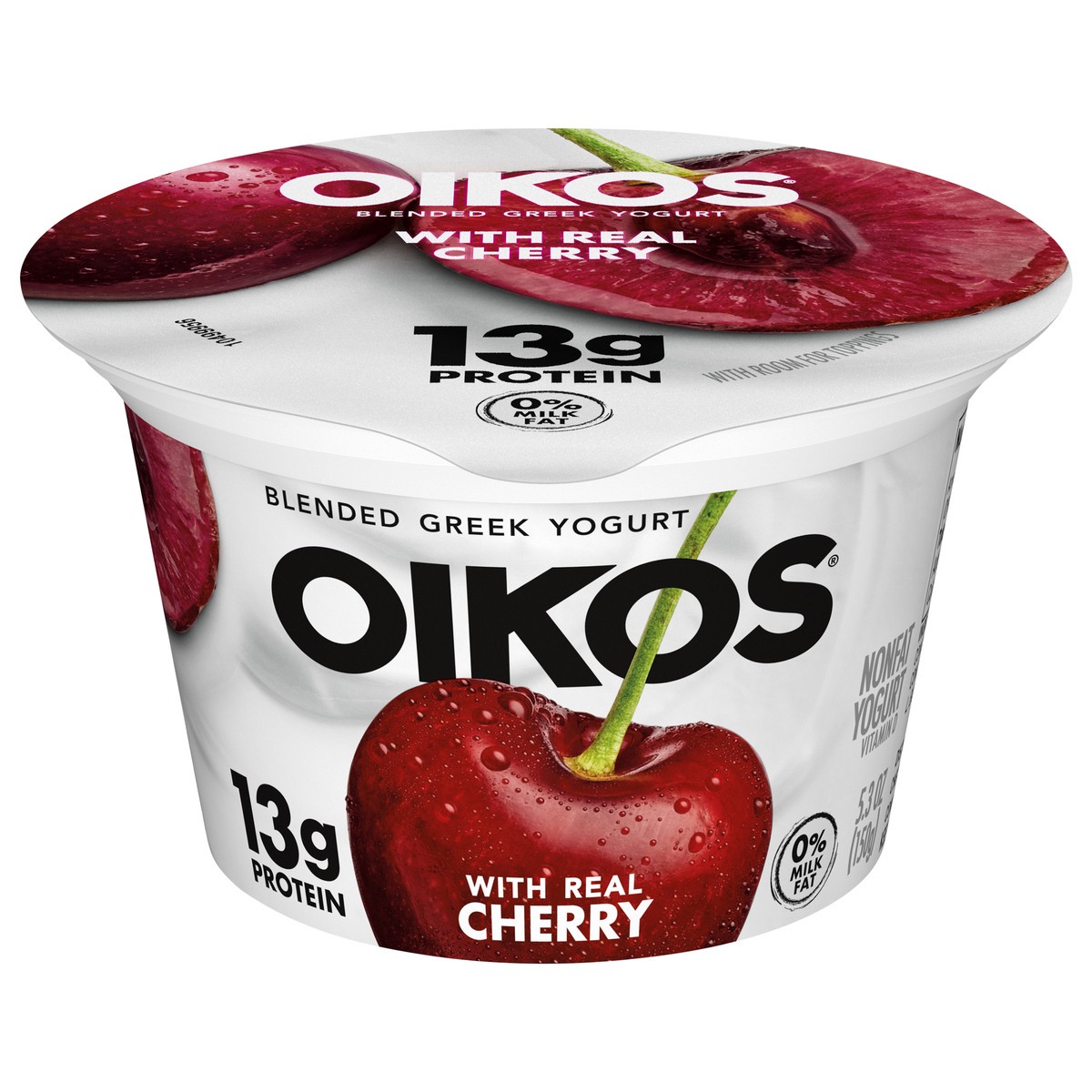 Oikos Blended Cherry Greek Nonfat Yogurt. High protein snacks with delicious, craveable flavor. Every sublime serving has 100 calories, 13g protein, 12g total sugar and 0% fat. We believe the best ing…
