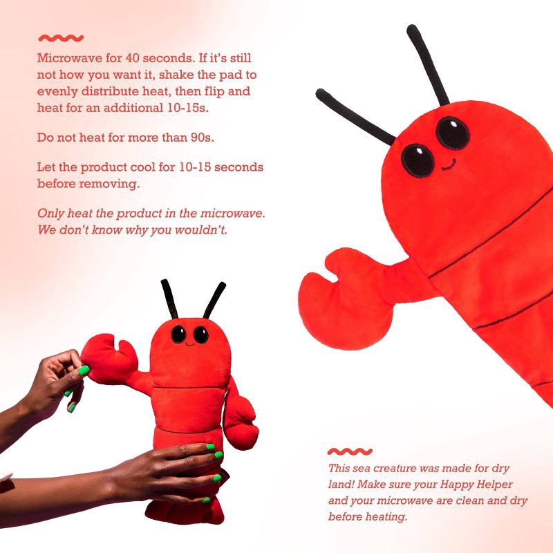 - Cramps Got You Down?: This cute little lobster brings soothing comfort and pain relief on tough days. It acts as a portable heating pad for cramps, muscle pain, and other areas of discomfort.