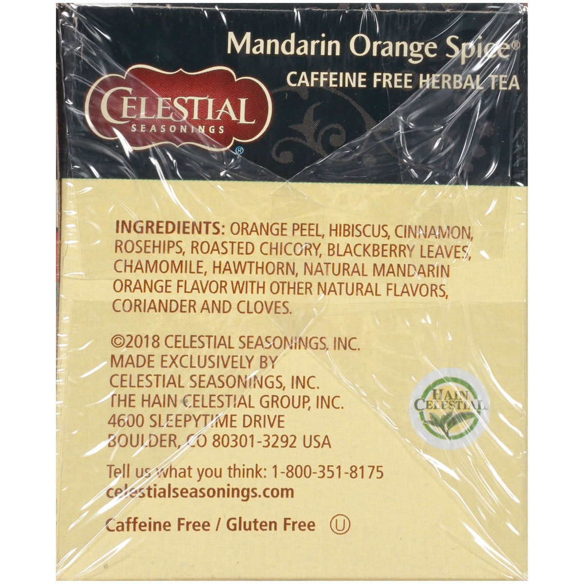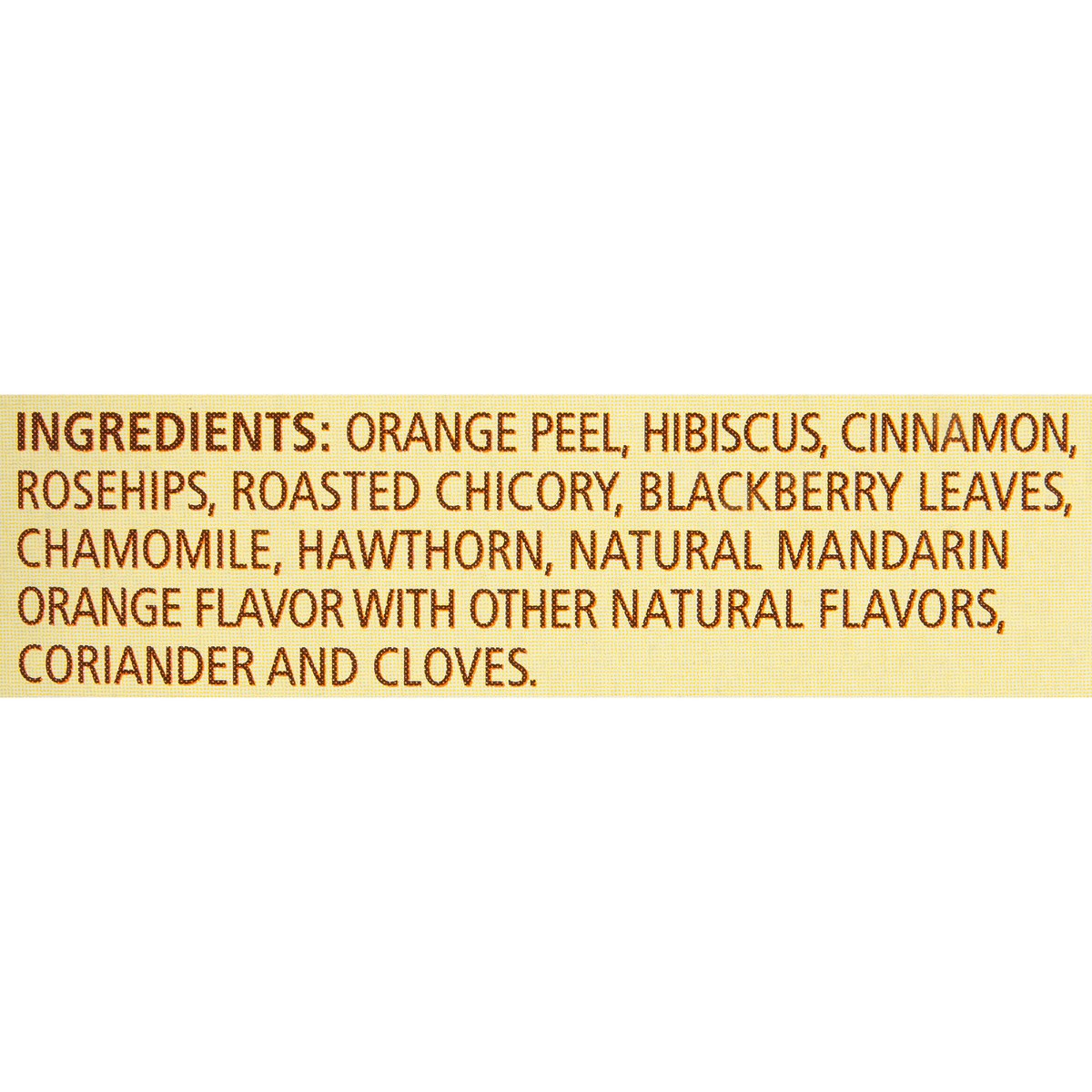 Orange Peel, Hibiscus, Cinnamon, Rosehips, Roasted Chicory, Blackberry Leaves, Chamomile, Hawthorn, Natural Mandarin Orange Flavor with Other Natural Flavors, Coriander and Cloves.