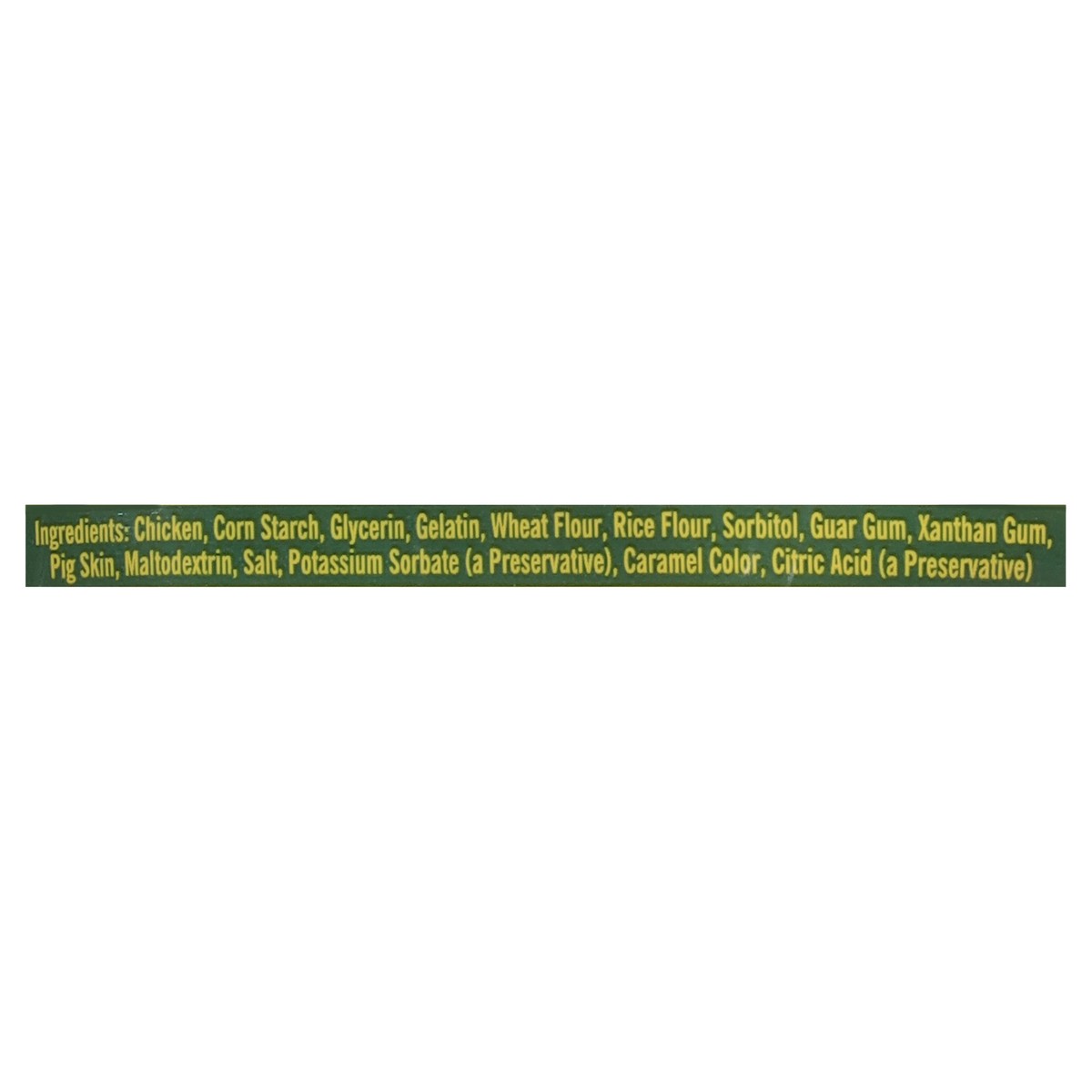 Chicken, Corn Starch, Glycerin, Gelatin, Wheat Flour, Rice Flour, Sorbitol, Guar Gum, Xanthan Gum, Pig Skin, Maltodextrin, Salt, Potassium Sorbate (a Preservative), Caramel Color, Citric Acid (a Prese…