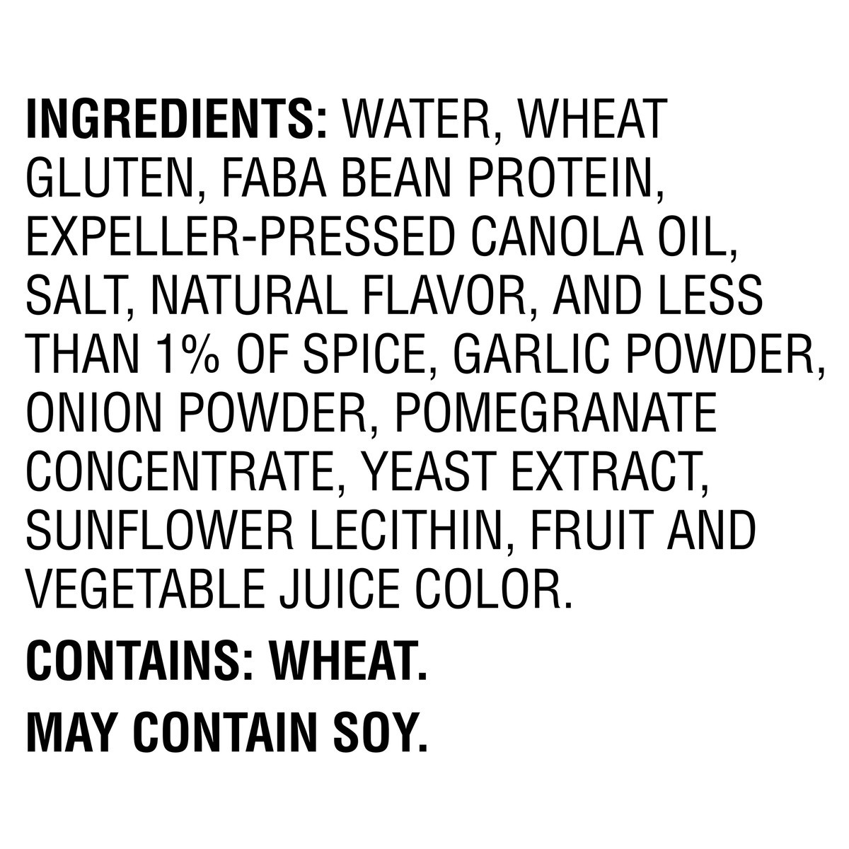Water, Wheat Gluten, Faba Bean Protein, Expeller-Pressed Canola Oil, Salt, Natural Flavor, and less than 1% of Spice, Garlic Powder, Onion Powder, Pomegranate Concentrate, Yeast Extract, Sunflower Lec…