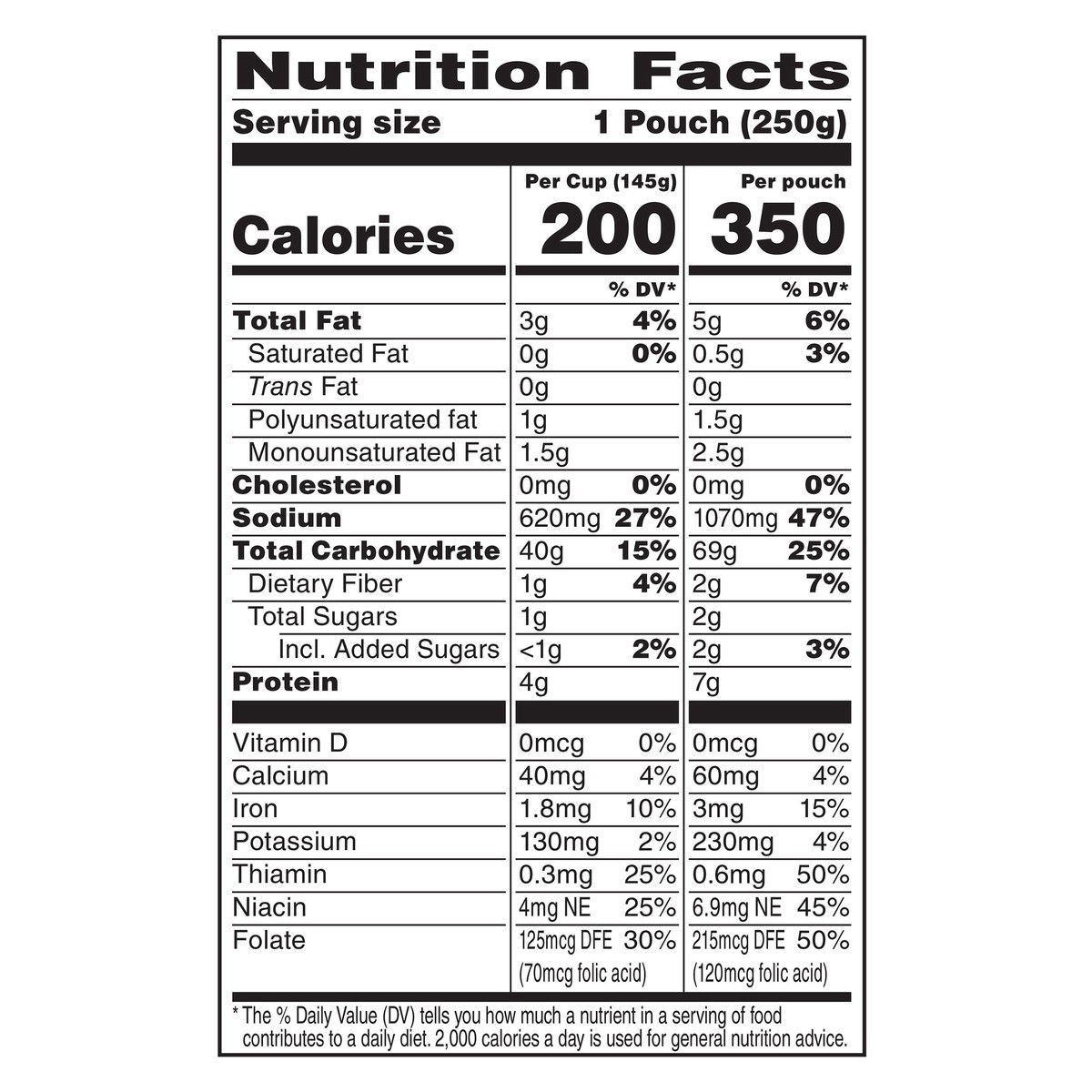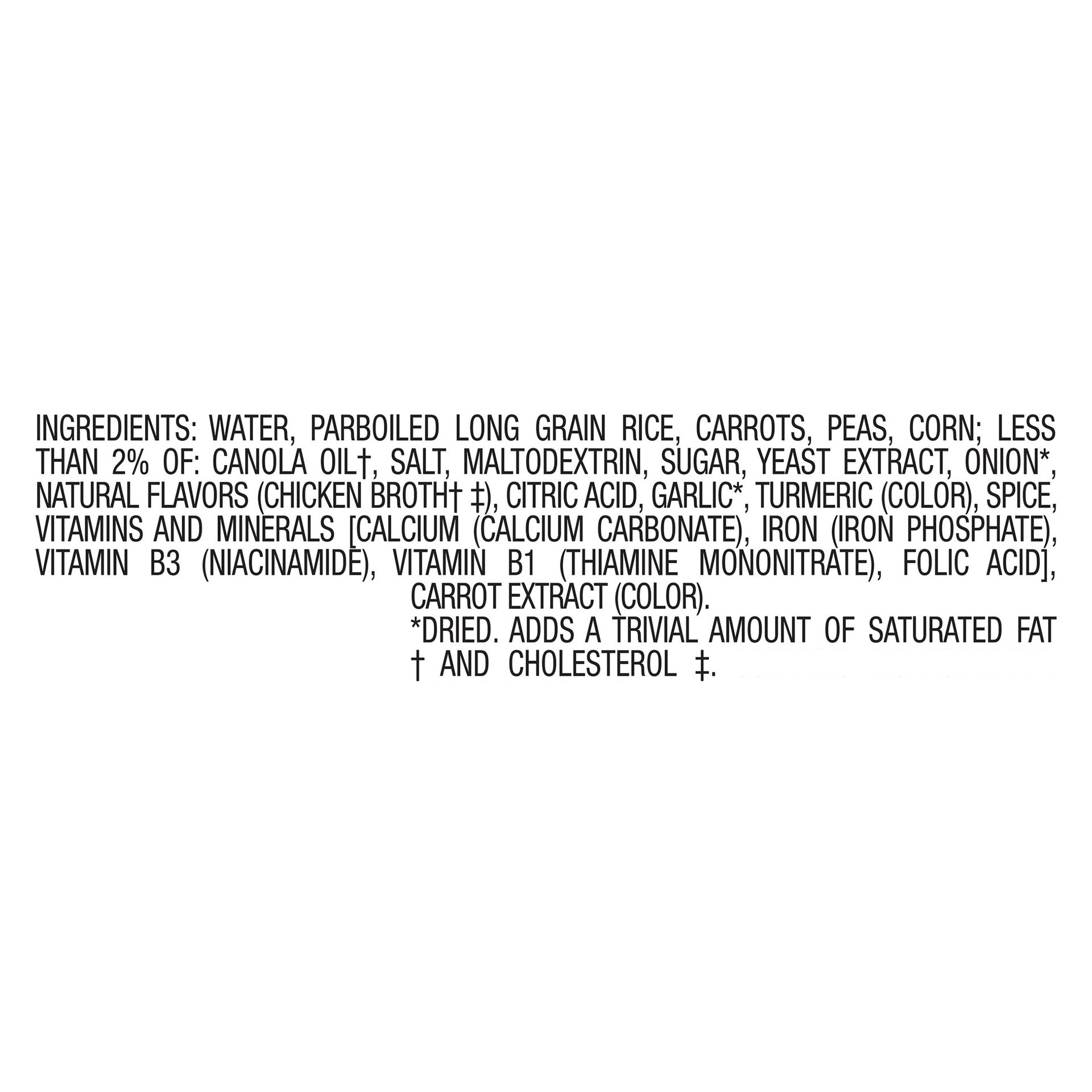 Water, Parboiled Long Grain Rice, Carrots, Peas, Corn; Less than 2% of: Canola Oil (Adds a Trivial Amount of Saturated Fat), Salt, Maltodextrin, Sugar, Yeast Extract, Onion (Dried), Natural Flavors (C…