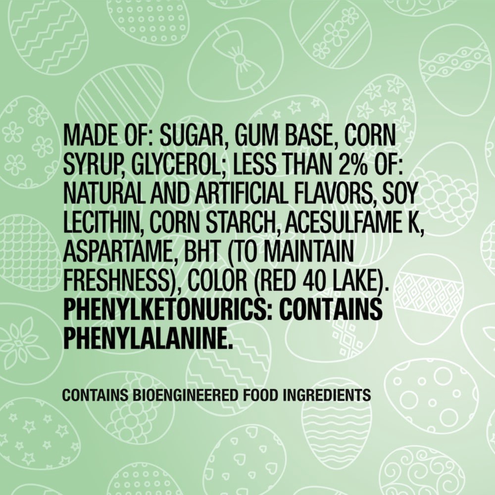 Made of: Sugar, Gum Base, Corn Syrup, Glycerol, Less than 2% of: Natural and Artificial Flavors, Soy Lecithin, Acesulfame K, Aspartame, BHT (to Maintain Freshness), Colors (Red 40 Lake).