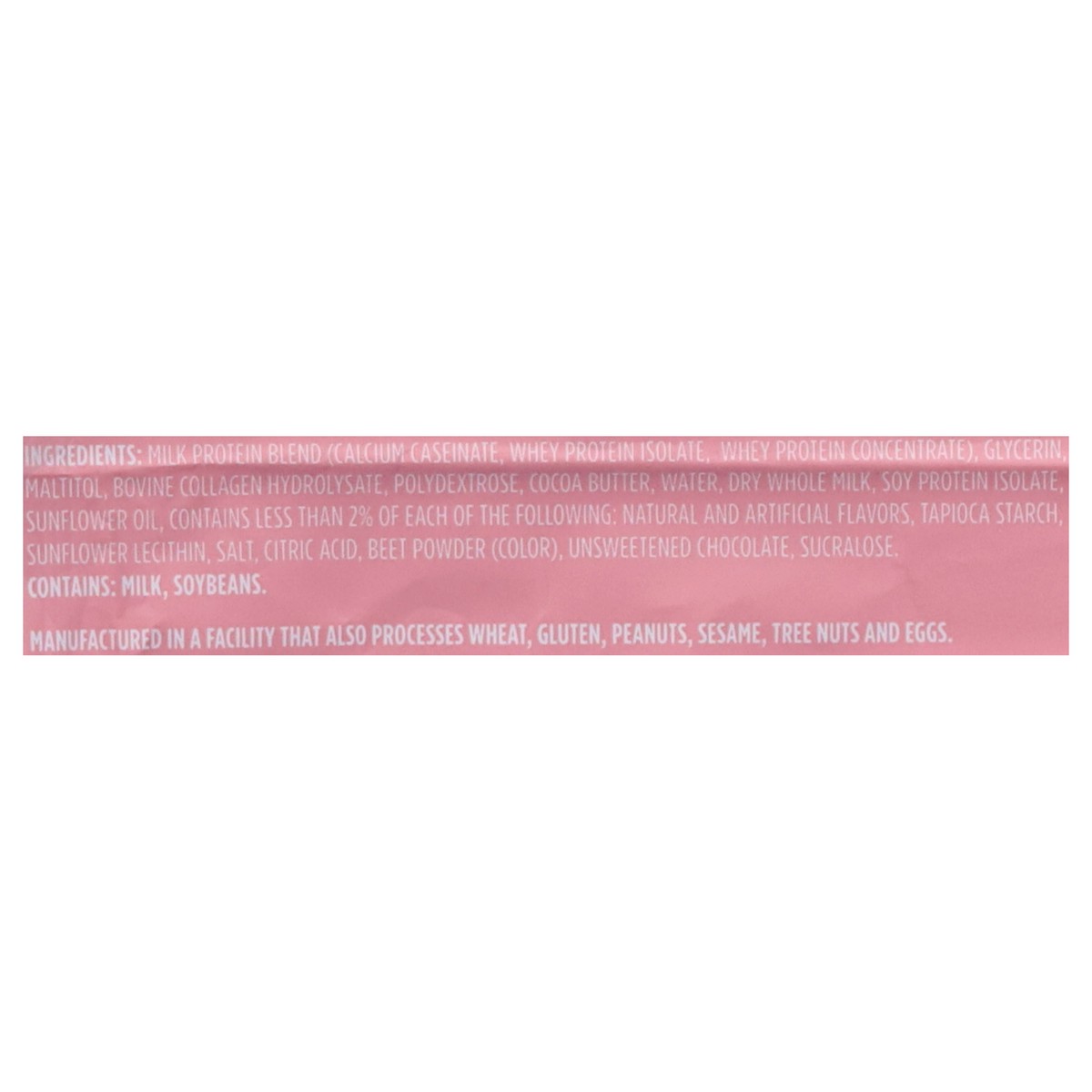 Milk Protein Blend (Calcium Caseinate, Whey Protein Isolate, Whey Protein Concentrate), Glycerin, Maltitol, Bovine Collagen Hydrolysate, Polydextrose, Cocoa Butter, Water, Dry Whole Milk, Soy Protein …