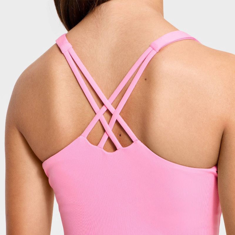 - Must-have features: moisture wicking, built-in shelf bra, sleeveless design with strappy crisscross back, cropped length, fitted style