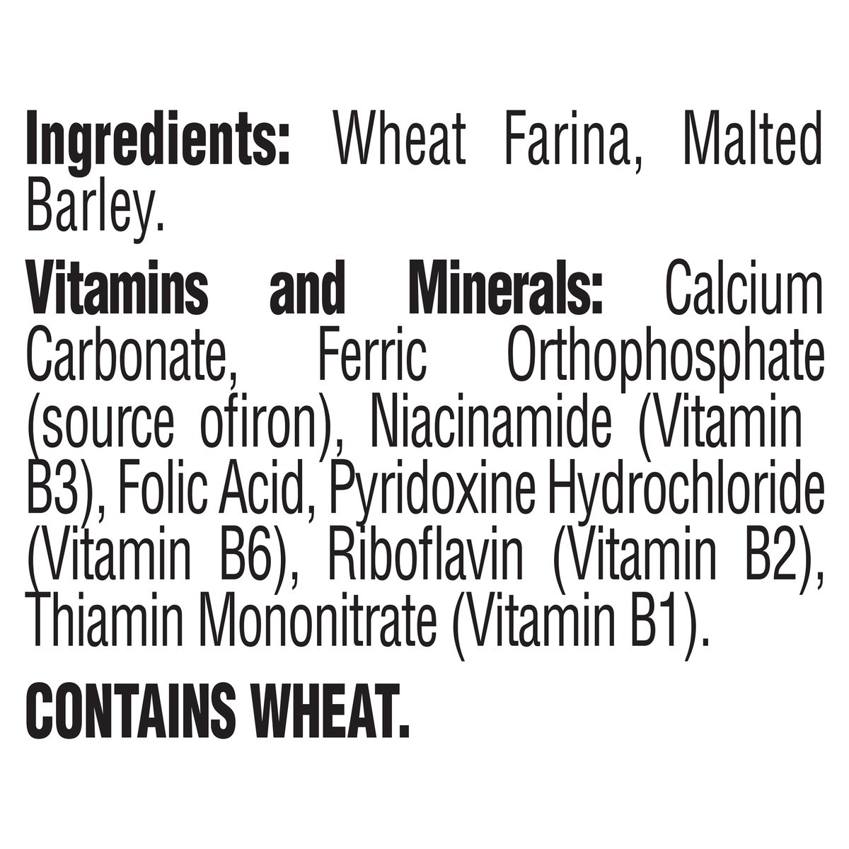 Wheat Farina, Malted Barley, Vitamins and Minerals: Calcium Carbonate, Ferric Orthophosphate (Source of Iron), Niacinamide (Vitamin B3), Folic Acid, Pyridoxine Hydrochloride (Vitamin B6), Riboflavin (…
