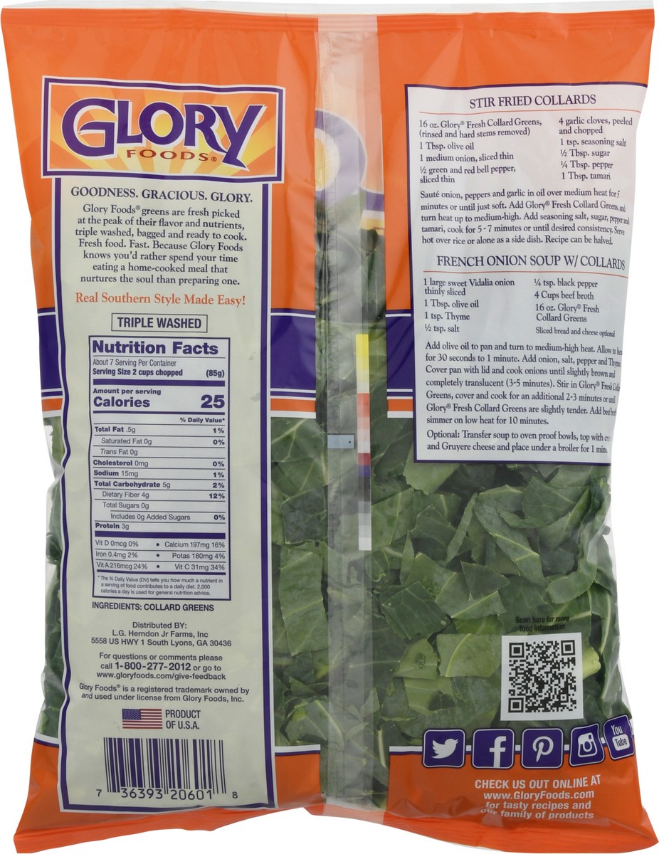 Family Owned. Triple washed. Real. Southern. Style. Goodness. Gracious. Glory. Glory Foods greens are fresh picked at the peak of their flavor and nutrients, triple washed, bagged and ready to cook. F…
