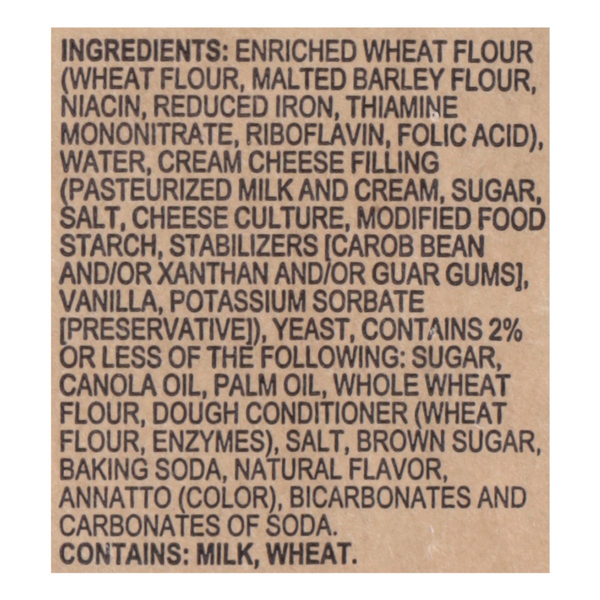 Enriched Wheat Flour (Wheat Flour\, Malted Barley Flour\, Niacin\, Reduced Iron\, Thiamine Mononitrate\, Riboflavin\, Folic Acid)\, Water\, Cream Cheese Filling (Pasteurized Milk and Cream\, Sugar\, S…