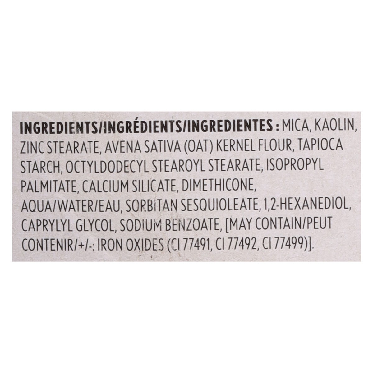 Mica, Kaolin, Zinc Stearate, Avena Sativa (Oat) Kernel Flour, Tapioca Starch, Octyldodecyl Stearoyl Stearate, Isopropyl Palmitate, Calcium Silicate, Dimethicone, Aqua/Water/Eau, Sorbitan Sesquioleate.…