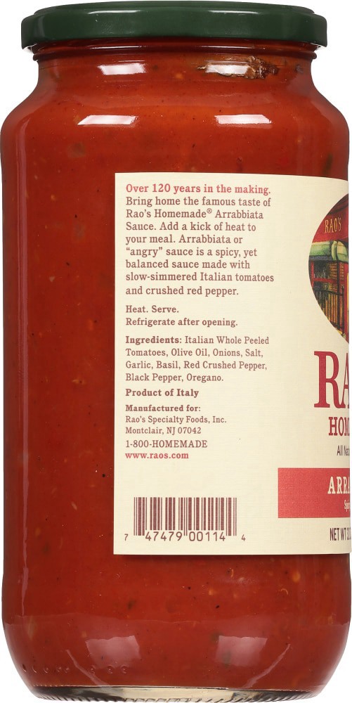 Rao’s Homemade Arrabbiata or “angry” Sauce is spicy pasta sauce made from tomatoes, garlic, olive oil, and crushed red peppers. Arrabbiata refers to the flavor profile of this pasta sauce made with th…