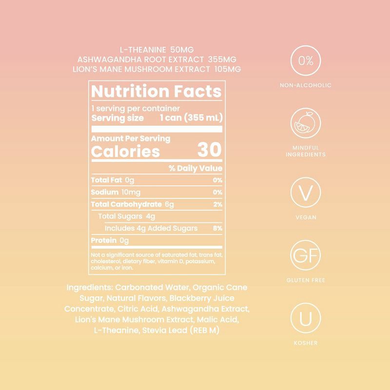 Carbonated Water, Organic Cane Sugar, Natural Flavors, Citric Acid, Grapefruit Juice Concentrate, Key Lime Juice Concentrate, Ashwagandha Extract, Fruit and Vegetable Juices for Color, Salt, Lion's Ma…