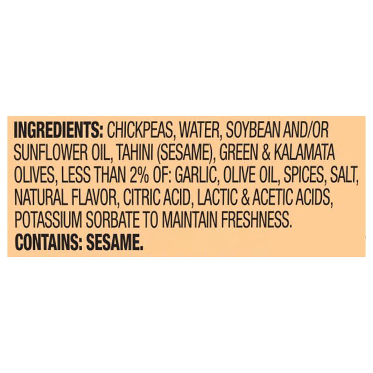 Chickpeas, Water, Soybean and/or Sunflower Oil, Tahini (Sesame), Green & Kalamata Olives, Less than 2% of: Garlic, Olive Oil, Spices, Salt, Natural Flavor, Citric Acid, Lactic & Acetic Acids, Potassiu…