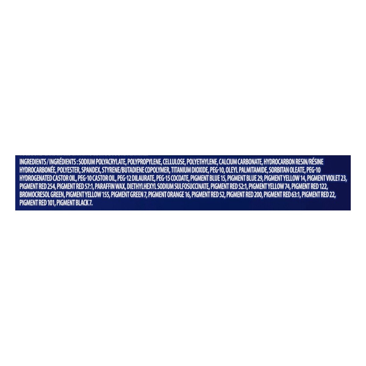 Sodium Polyacrylate, Polypropylene, Cellulose, Polyethylene, Calcium Carbonate, Hydrocarbon Resin/Resine Hydrocarbonee, Polyester, Spandex, Styrene/Butadiene Copolymer, Titanium Dioxide, PEG-10, Oleyl…