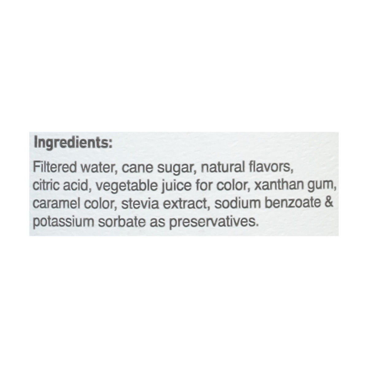Filtered Water, Cane Sugar, Natural Flavors, Citric Acid, Vegetable Juice for Color, Xanthan Gum, Caramel Color, Stevia Extract, Sodium Benzoate & Potassium Sorbate as Preservatives.