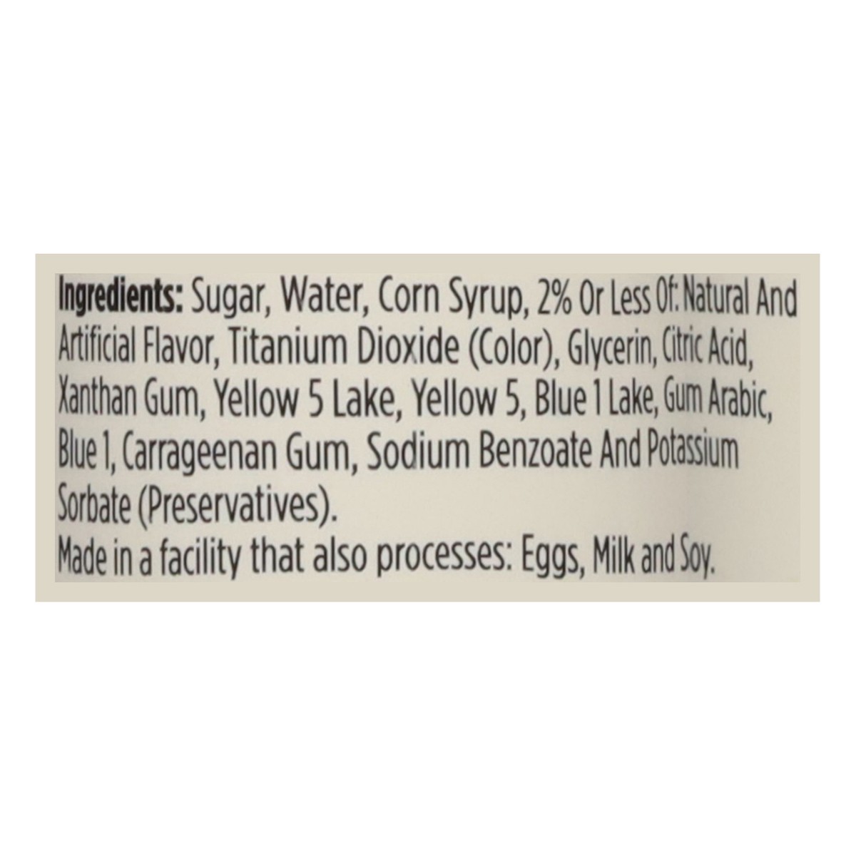 Sugar, Water, Corn Syrup, 2% or Less of: Natural and Artificial Flavor, Titanium Dioxide (Color), Glycerin, Citric Acid, Xanthan Gum, Yellow 5 Lake, Yellow 5, Blue 1 Lake, Gum Arabic, Blue 1, Carragee…