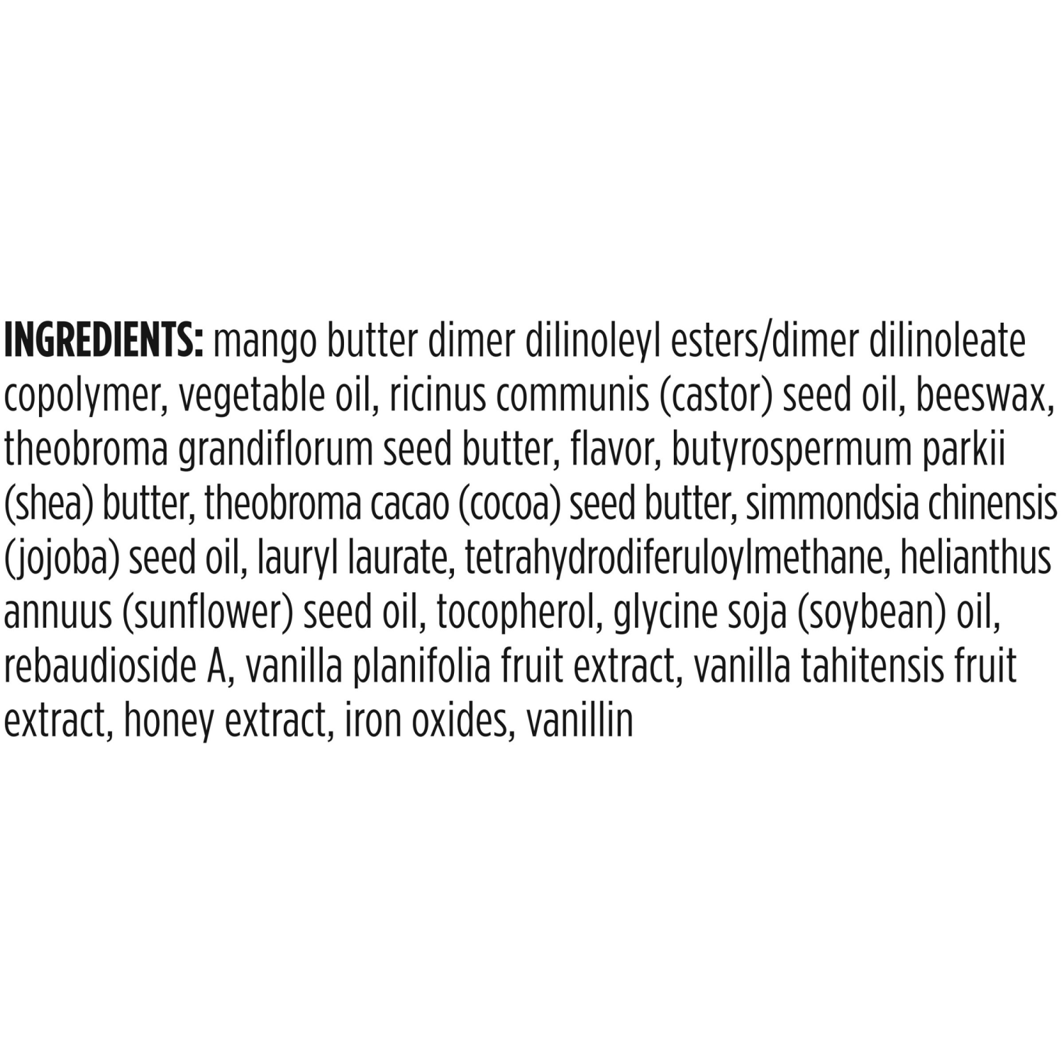 Mango Butter Dimer Dilinoleyl Esters/Dimer Dilinoleate Copolymer, Vegetable Oil, Ricinus Communis (Castor) Seed Oil, Beeswax, Theobroma Grandiflorum Seed Butter, Flavor, Butyrospermum Parkii (Shea) Bu…